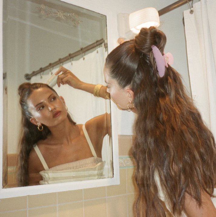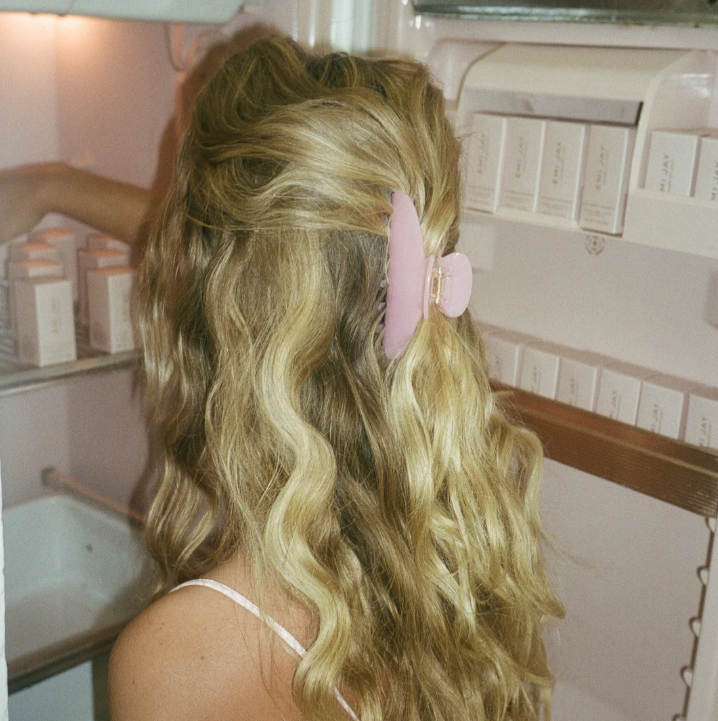 Our most-loved claw clip. Big enough to hold a full head of hair and functional enough to wear from morning to night. No pull, just good hair. Use this hair claw clip on dry or wet hair. The dreamiest shade of pink to elevate any outfit.