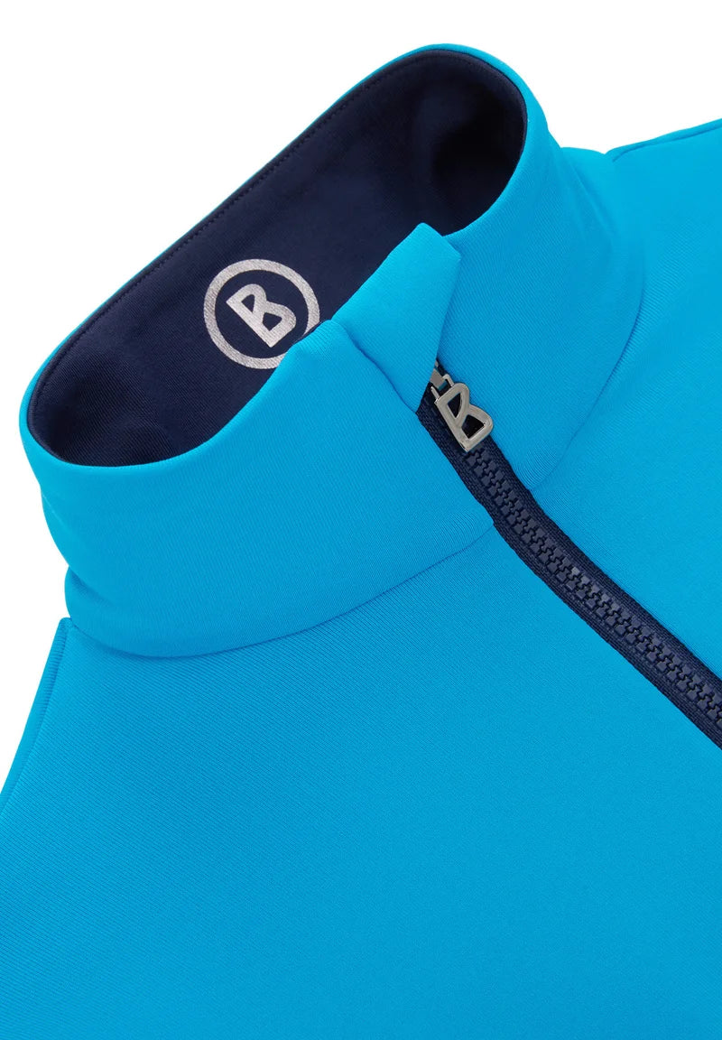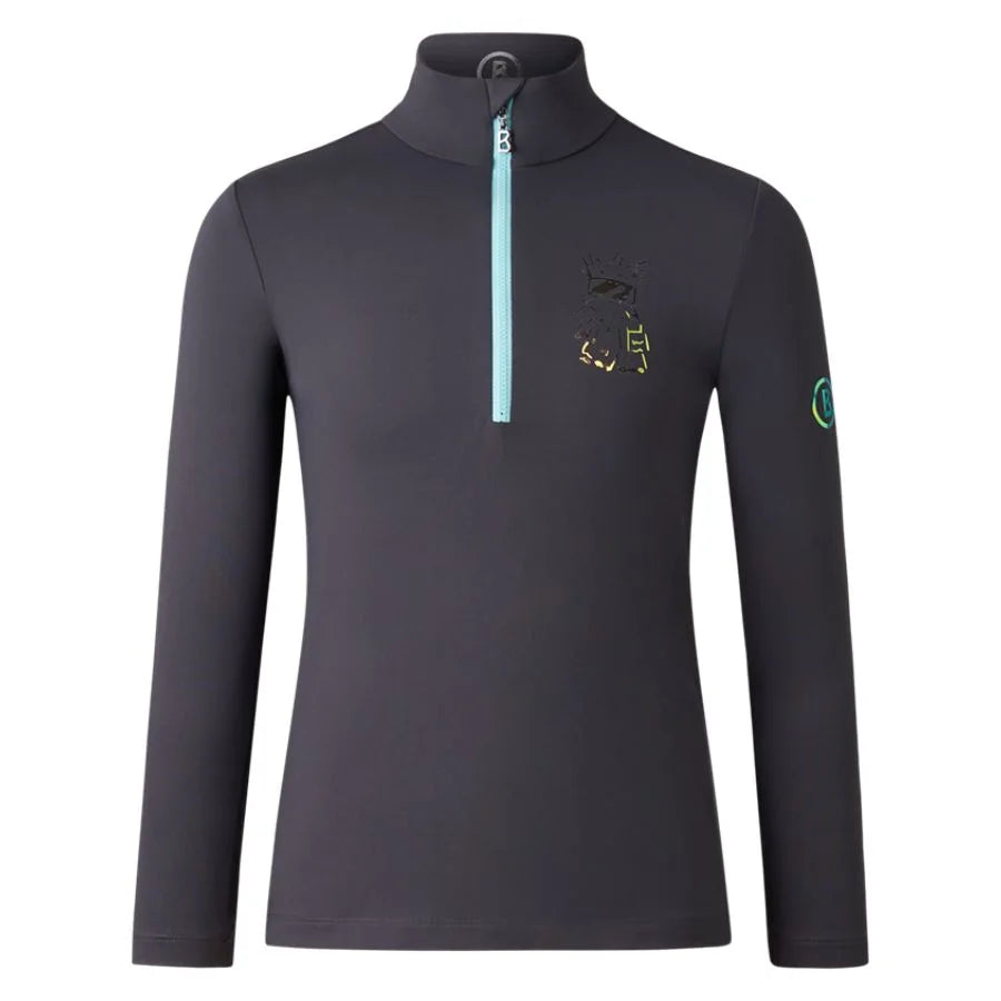 The Bogner Benno Kids first layer is a functional and stylish base layer for children, designed for outdoor and alpine activities. It features a zip-up stand-up collar, is made from breathable and moisture-regulating technical fibers, and includes a "Yeti" design print and logo. The garment has reinforced cuffs for a snug fit and offers comfort, protection, and unrestricted movement.