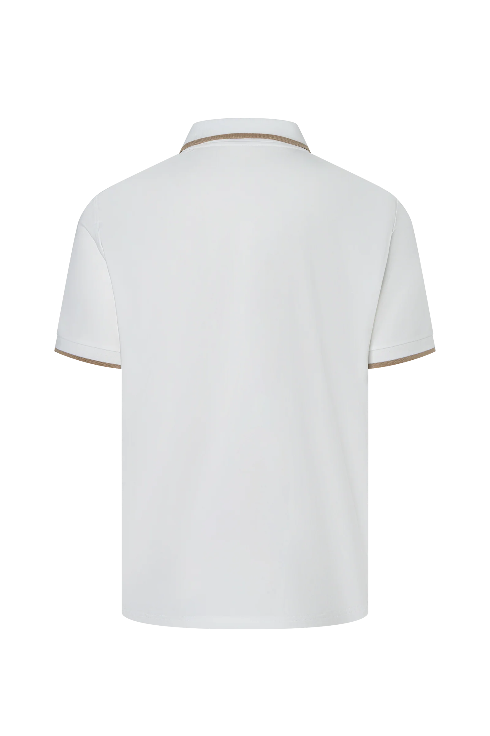Sleeves and cuffs: The polo has short sleeves with elasticated ribbed cuffs, also with contrasting details.