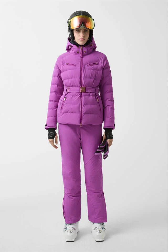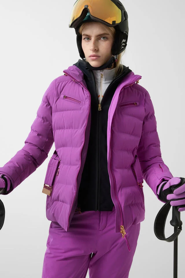 The Ellya quilted ski jacket has an impressive design with a detachable softshell inlay, drawstring hood and belt at waist height. Functional details such as the internal snow guard and the underlaid two-way zip characterise this piece, which is complemented by taped seams in critical areas. Signature details add a stylish finish.
