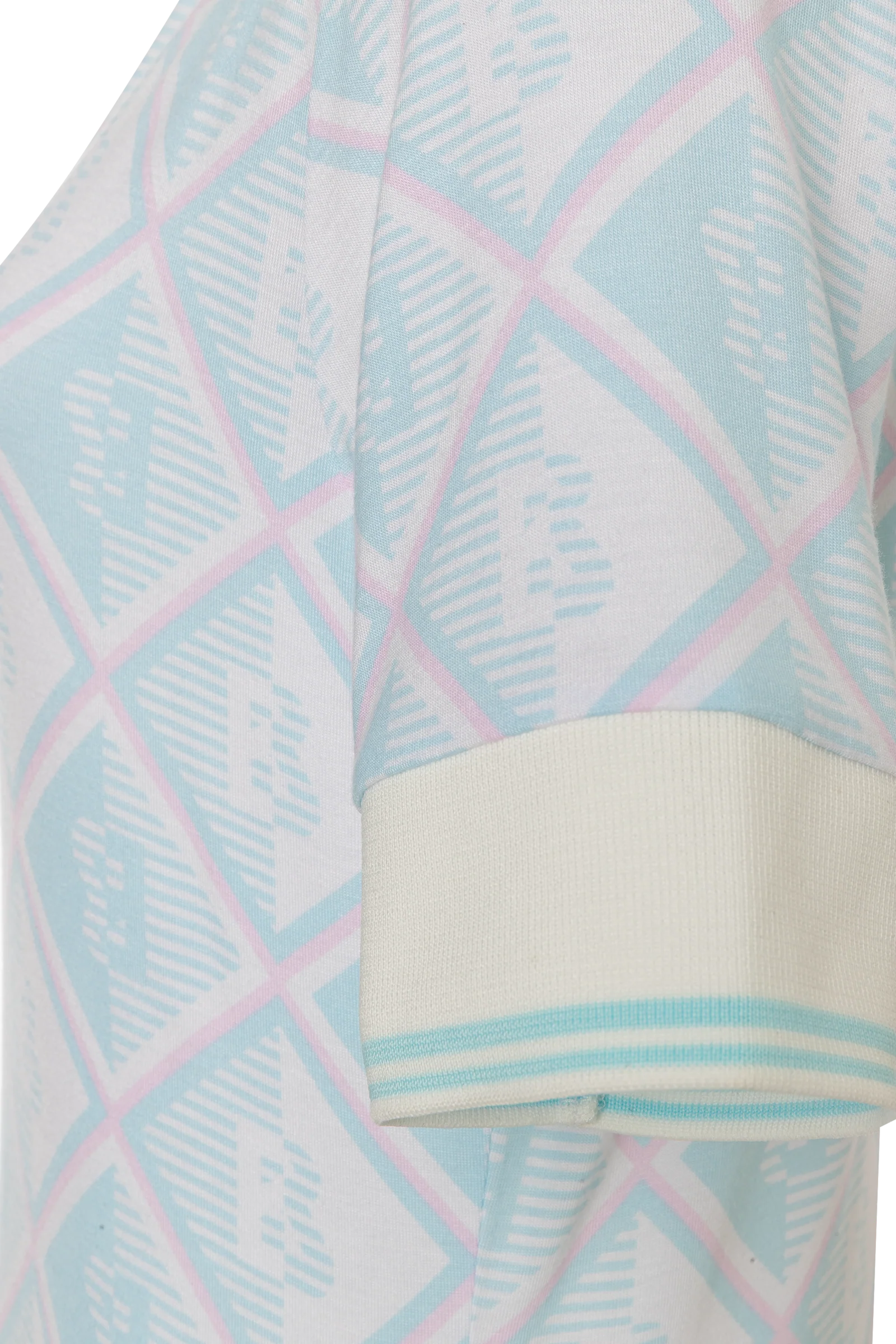 Sleeves: Short sleeves with wide ribbed cuffs and contrasting stripe details.