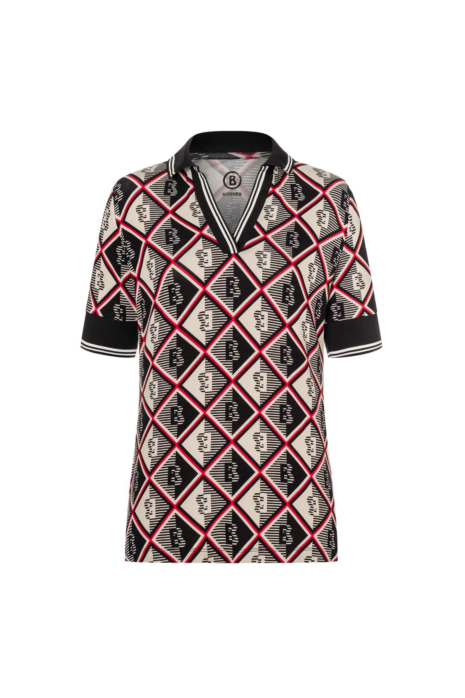 The BOGNER Elonie Functional Polo Shirt is a women's regular-fit golf and casual polo shirt made from technical, quick-drying piqué knit fabric. It features a combination of a classic polo collar with a V-neck and contrasting stripe detailing for a feminine and sporty look.