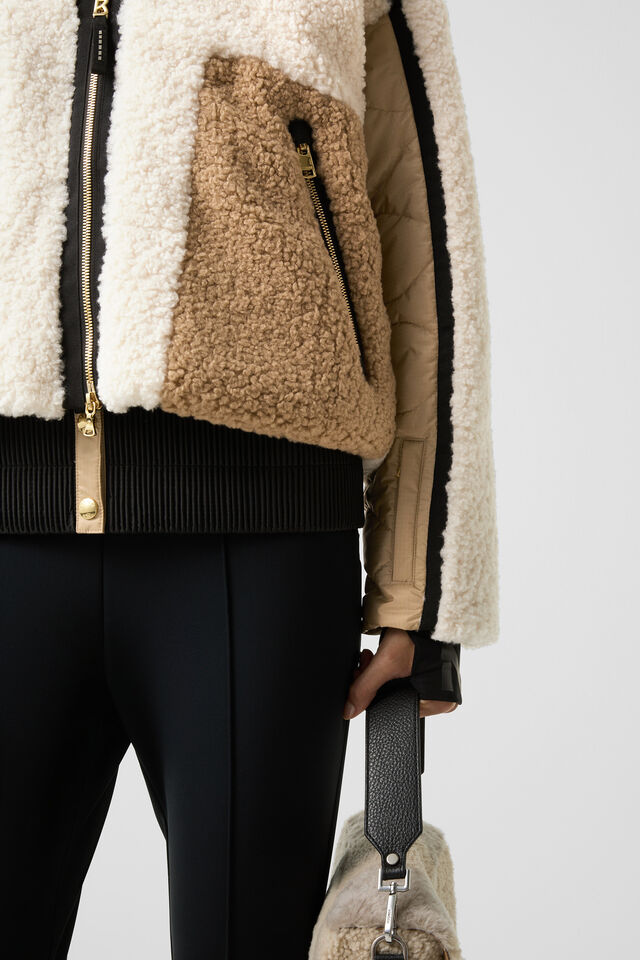 As a modern piece on the piste, the Kora ski jacket impresses with its design mix of teddy and quilted ripstop sections, accentuated by grosgrain ribbon details and typical label accents. The goose down padding and technical fibres provide warmth. The smocked, buttoned waistband adds a functional finishing touch.