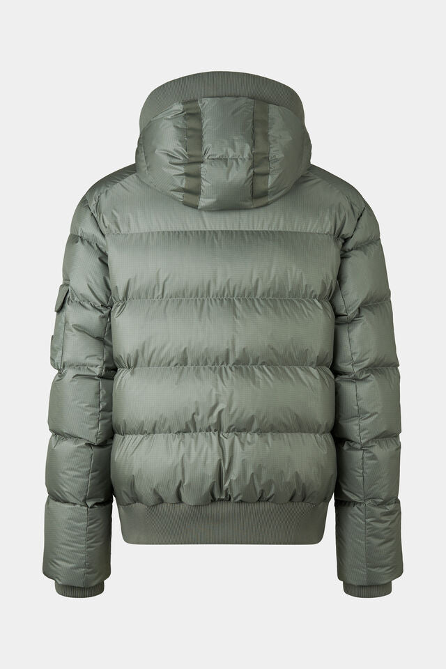 The Samir down ski jacket offers performance for the slopes in water-resistant ripstop fabric and with heat-insulating goose down and feather padding, functionally complemented by the inner snow skirt and ski pass pocket. Ribbed cuffs and grosgrain ribbon accents provide a modern look.