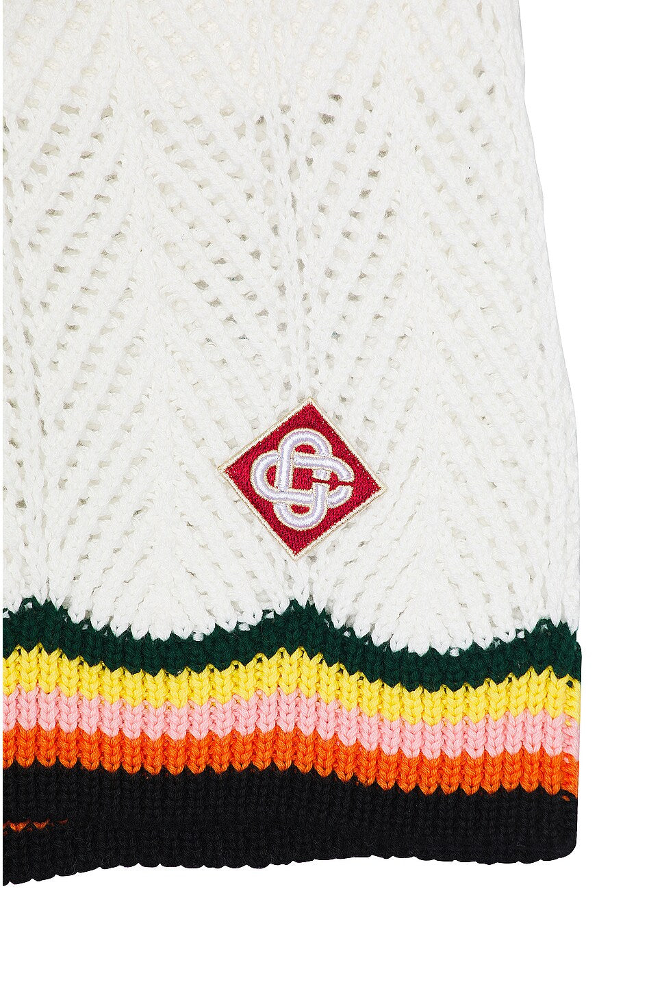 Self: 100% cottonAppliqué: 95% rayon, 5% polyester. Made in China. Hand wash. Pull-on styling with elastic waistband and interior drawstring tie closure. Side seam pockets. Open knit fabric with contrast trim and logo patch at left leg. Garment is made with a semi-sheer fabric, undergarments can show through. Item not sold as a set.