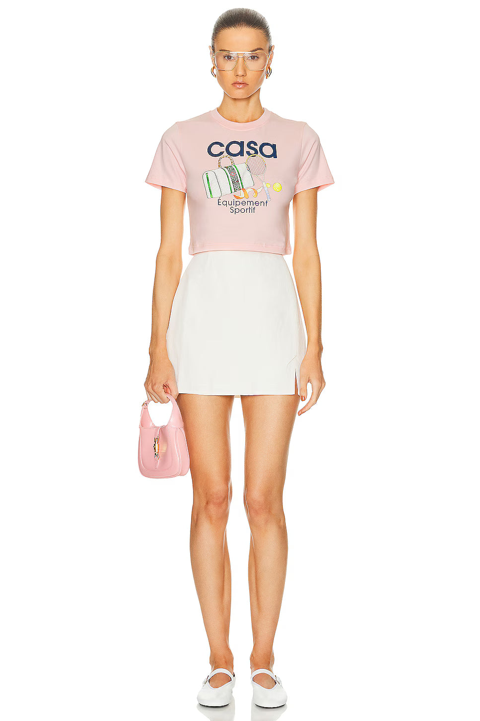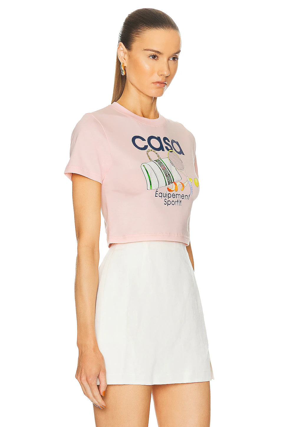 Design: The front features a "playful graphic" and text centered around a tennis theme. The words "ÉQUIPEMENT SPORTIF" are also printed on the shirt. The cut is described as a "baby t-shirt" with a cropped hem that typically hits above the navel.