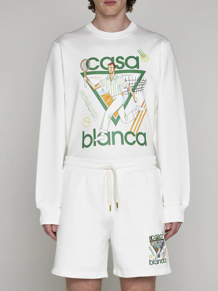 Merging the worlds of luxury and casual wear, Casablanca offers sportswear-influenced styles that are refined yet easygoing, reinterpreting the enduring après-sport aesthetic for the modern age. These sweat shorts, perfect for those chill days, are made from soft organic cotton and hit just above the knee. They come with a gold-tipped drawstring closure, side pockets, a back pocket, and a label proudly displaying the Casablanca brand. 100% Organic Cotton, Elasticated Drawstring Waist, 2 Side Pockets, Back Pocket, Embroidered Branding, Made in Portugal, Delicate Machine Wash, Casablanca. Casablanca Men's Casa Way Embroidered Sweat Shorts in Off White