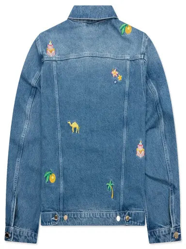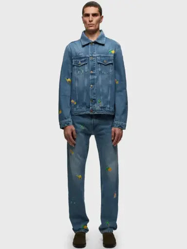 The motif denim jacket is a classic silhouette crafted from 100% cotton for a classic fit. Finished with embroidered artwork representing the house s symbology with nature and architecture, chest pockets and gold hardware closure. Intended to be worn with its coordinating straight-leg jeans