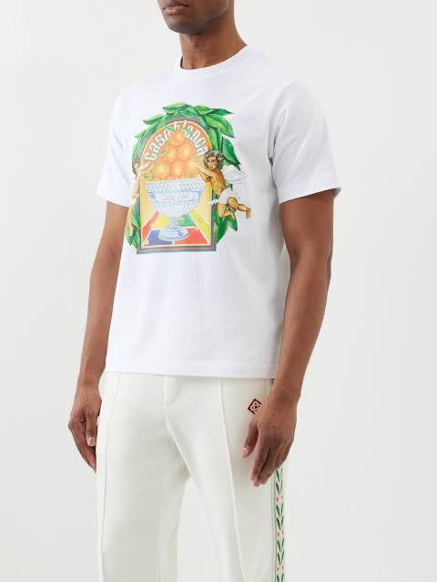 The CASABLANCA Triomphe D'Orange Printed Unisex T-Shirt features an artistic graphic of oranges and a tennis-inspired trophy on a white or black background, with larger branding details on the back. It is crafted from 100% organic cotton jersey and cut for a relaxed, comfortable fit.