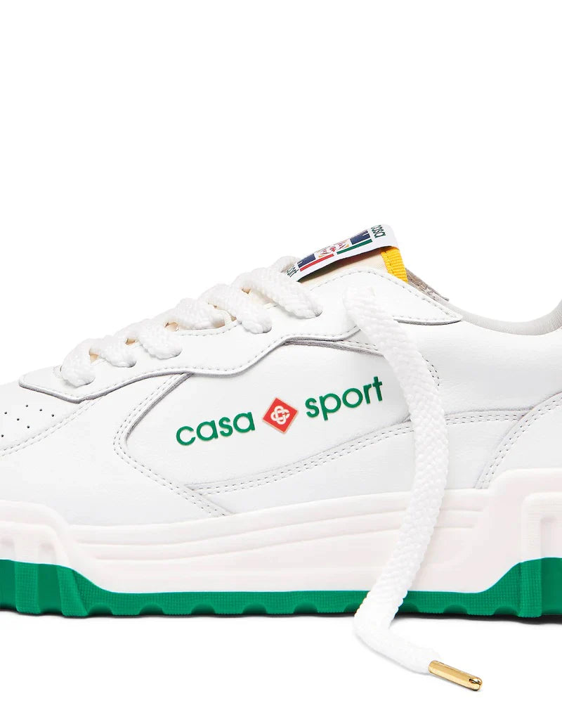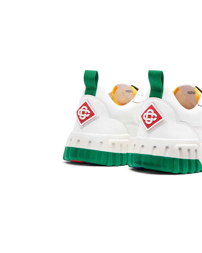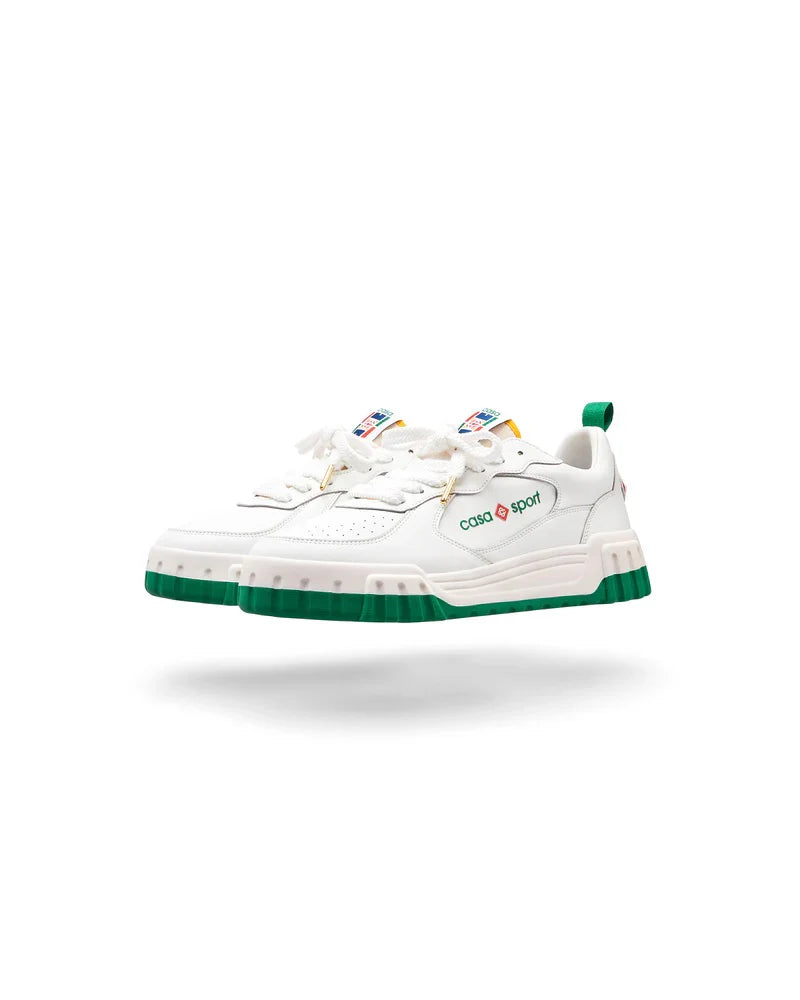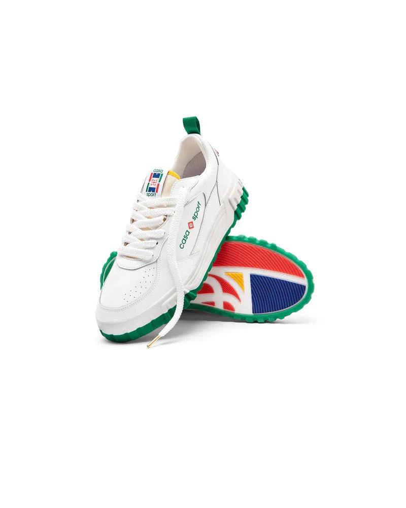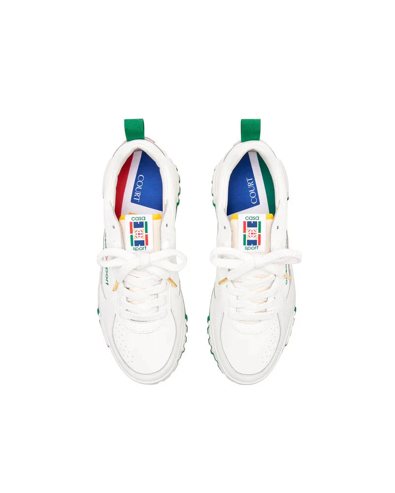 The Casablanca WM Court Sneakers are low-top sneakers with a design inspired by \'90s silhouettes and the brand's tennis and classic architecture aesthetic. They feature a calf leather upper, often with a panelled design, perforated details, and a round toe with a front lace-up closure. Key branding elements include the signature diamond motif on the heel, a logo patch on the tongue, and a "Casa Sport" or "Casablanca" logo on the side. They are finished with a branded leather insole and a chunky rubber sole, often with multi-color details.