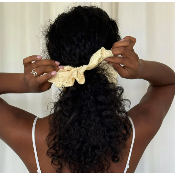Simple and chic, our eyelet scrunchies feature a linen decorated design for added charm. A must-have statement accessory, they can be styled as bracelets or used to adorn any bun, completing your daytime look.