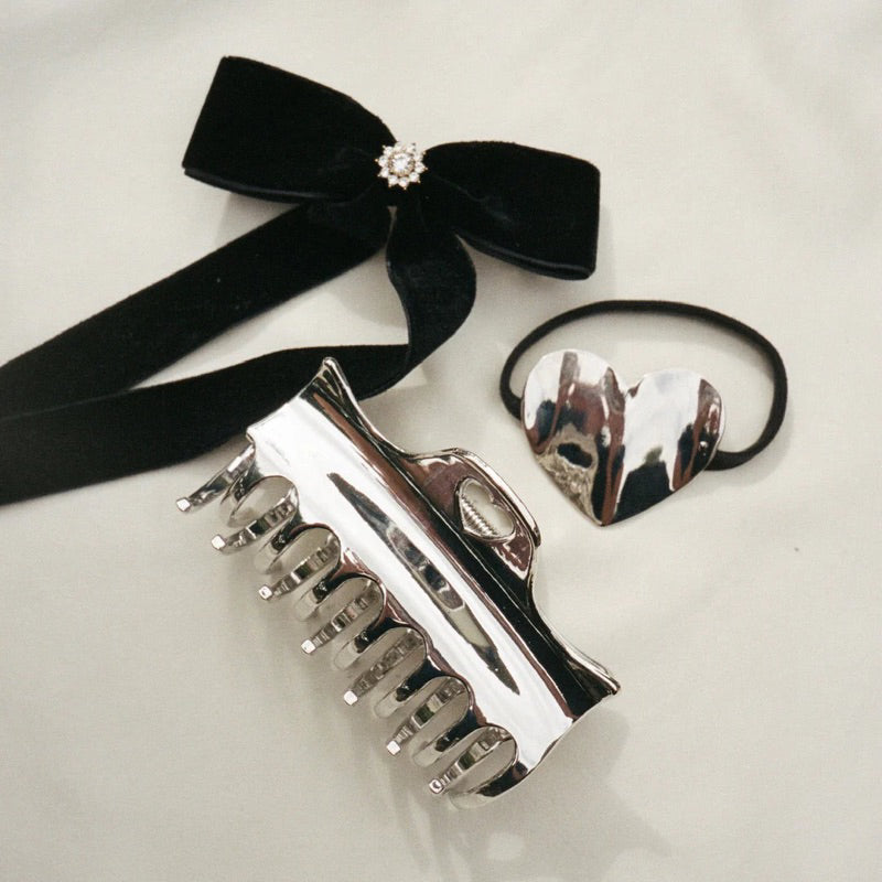 Here to make a statement and add a bit of sophistication to any hair style, this hair tiefeatures a solid metal heart adornment. The interior of the hair tie is lined with extra elastic for an instant ponytail upgrade. Available in 2 shades.