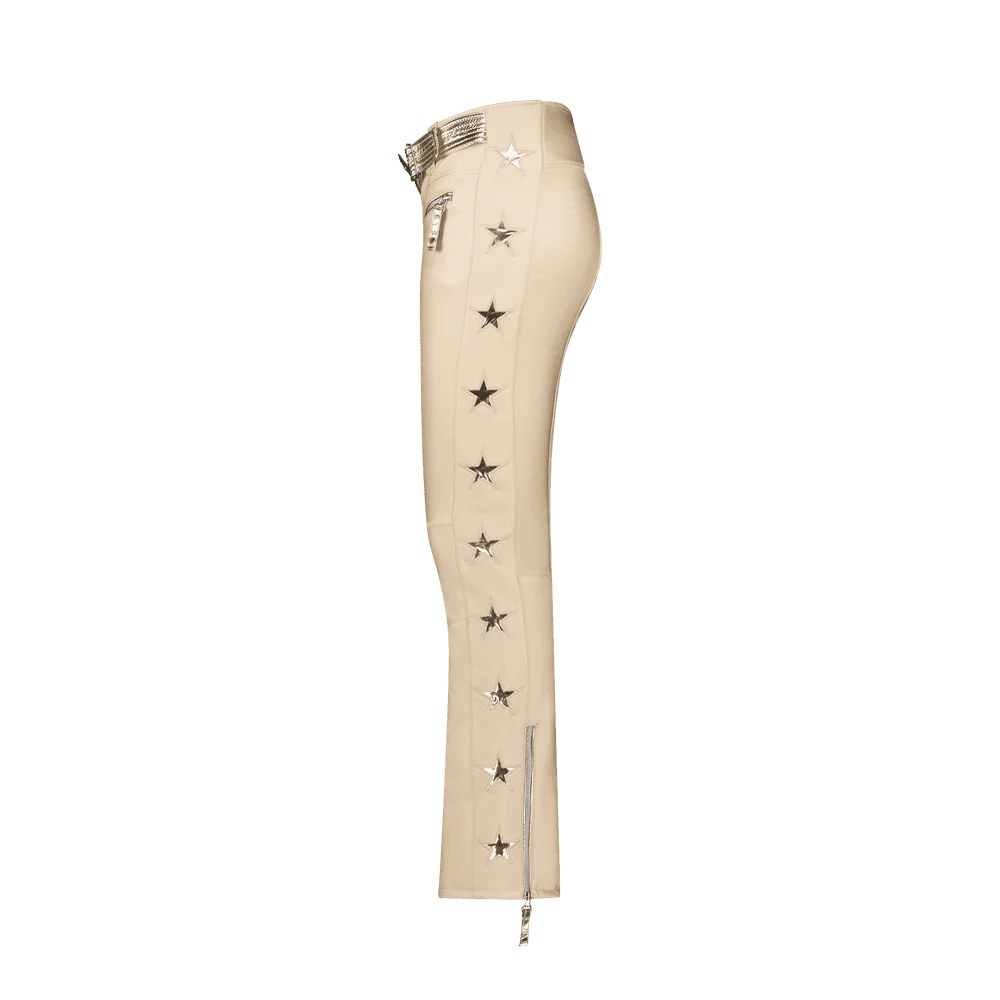 The JETSET TIBY SKI PANTS GLAM IVORY are slim-fit ski pants featuring a chic, athletic design with star motifs down the legs. They are made from Schoeller 2-way stretch fabric, which is water-repellent, windproof, and breathable.