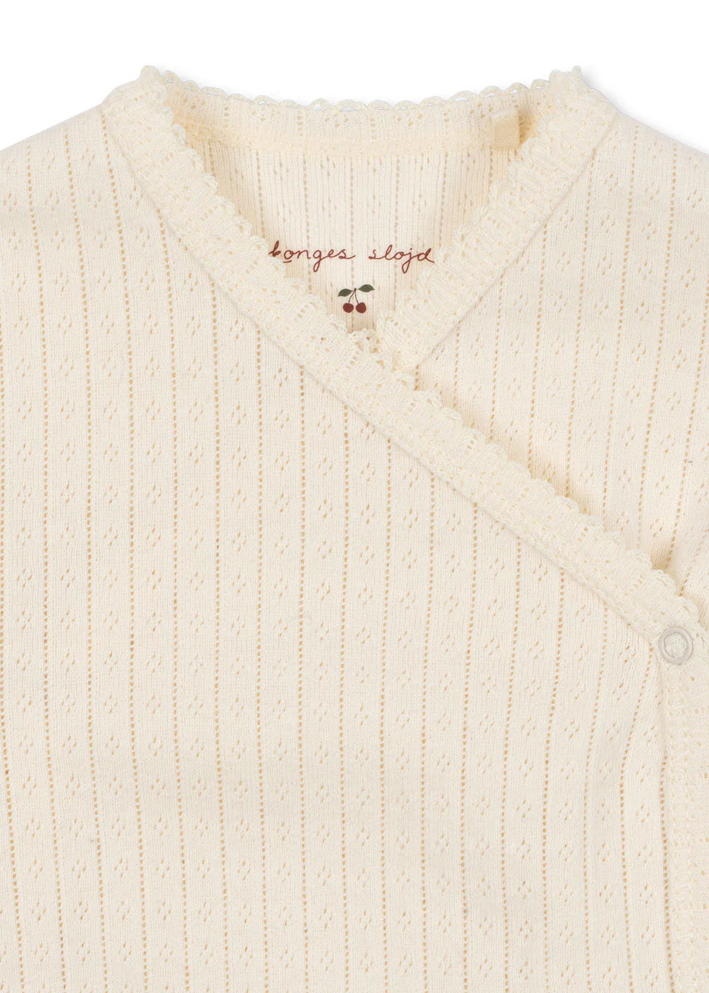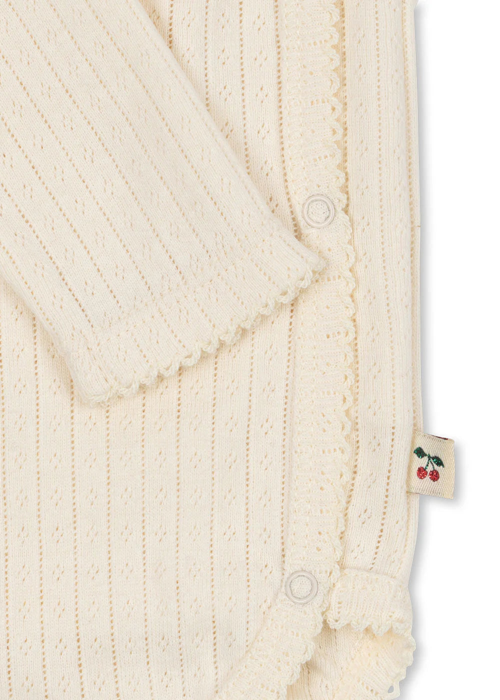 Soft body with decorative pointelle and easy wrap closure. Snap buttons along the side of the body and crotch for easy dressing.
