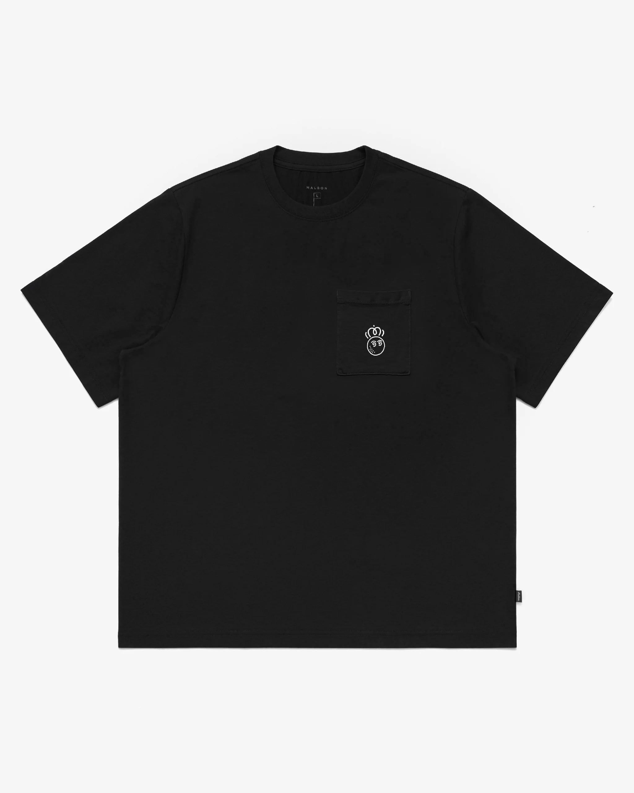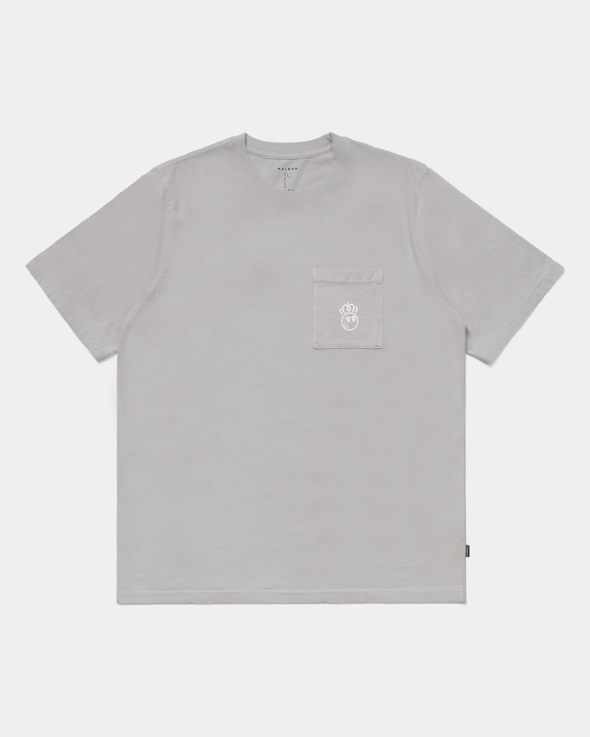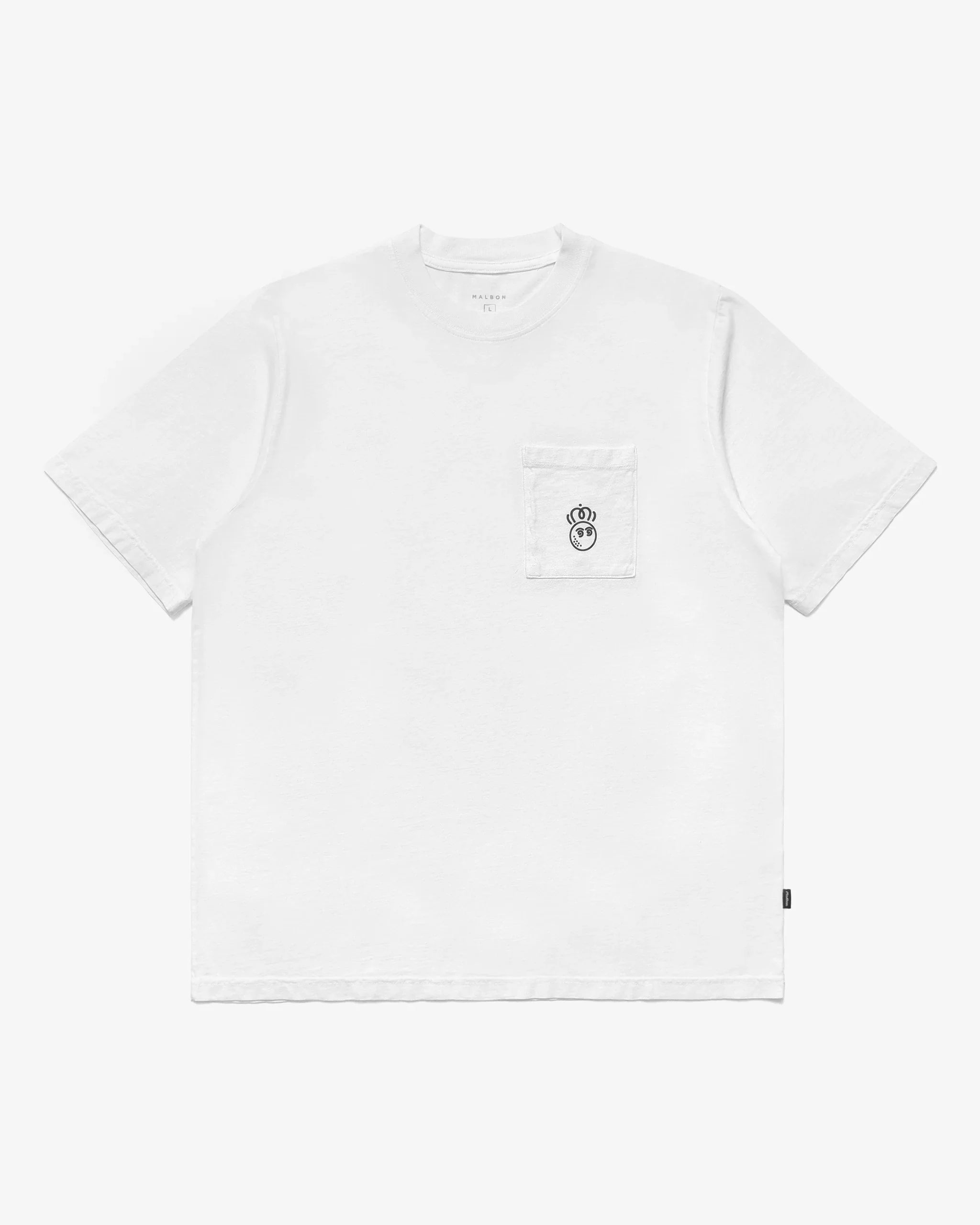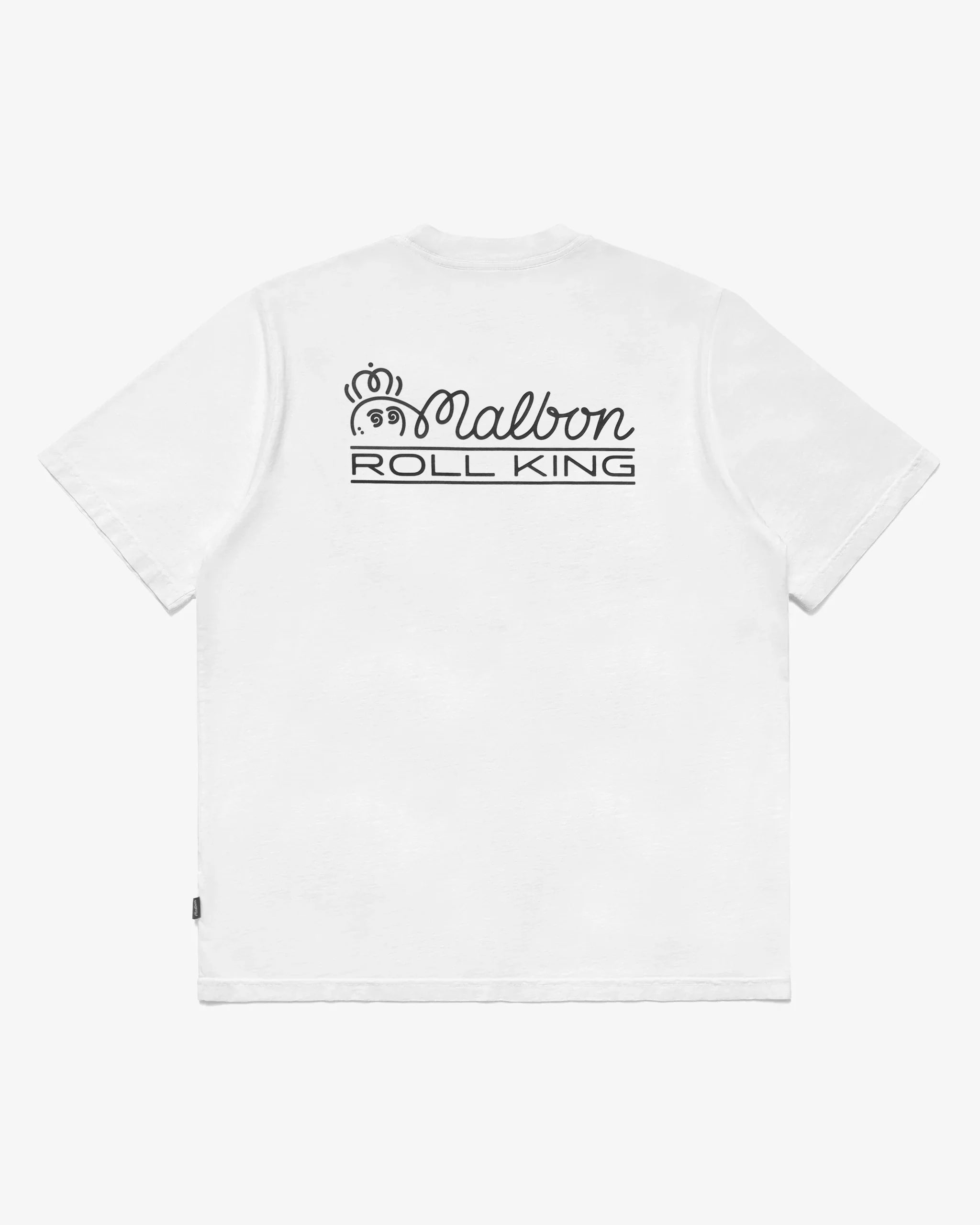 The Roll King Pocket T-Shirt is made from 100% Cotton Jersey with a Cotton Rib Neckband for optimal comfort. Featuring the Roll King Buckets on the Left Chest and Roll King Graphic on the back, finished with a Malbon Script Woven Label sewn on the Left Seam.