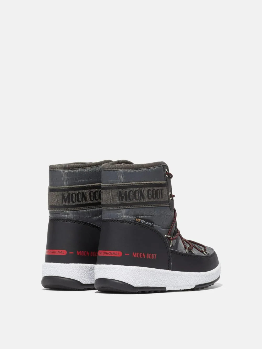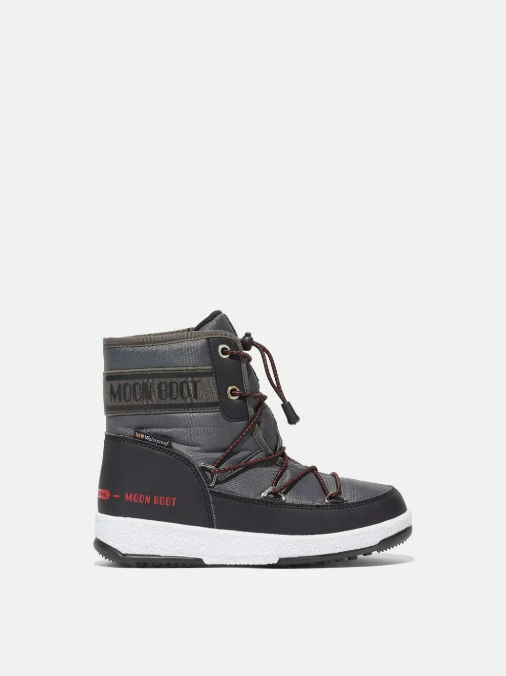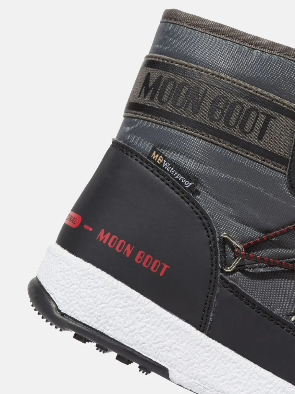 The Moon Boot Junior Boy Mid is a scaled-down, mid-calf height, insulated snow boot designed for children, inspired by NASA astronaut gear, offering warmth and weather protection through a waterproof membrane and nylon upper.