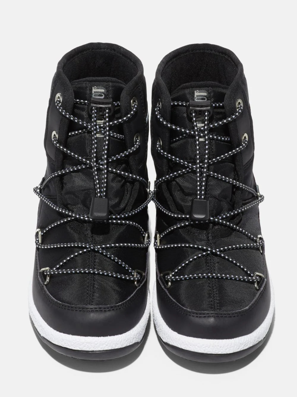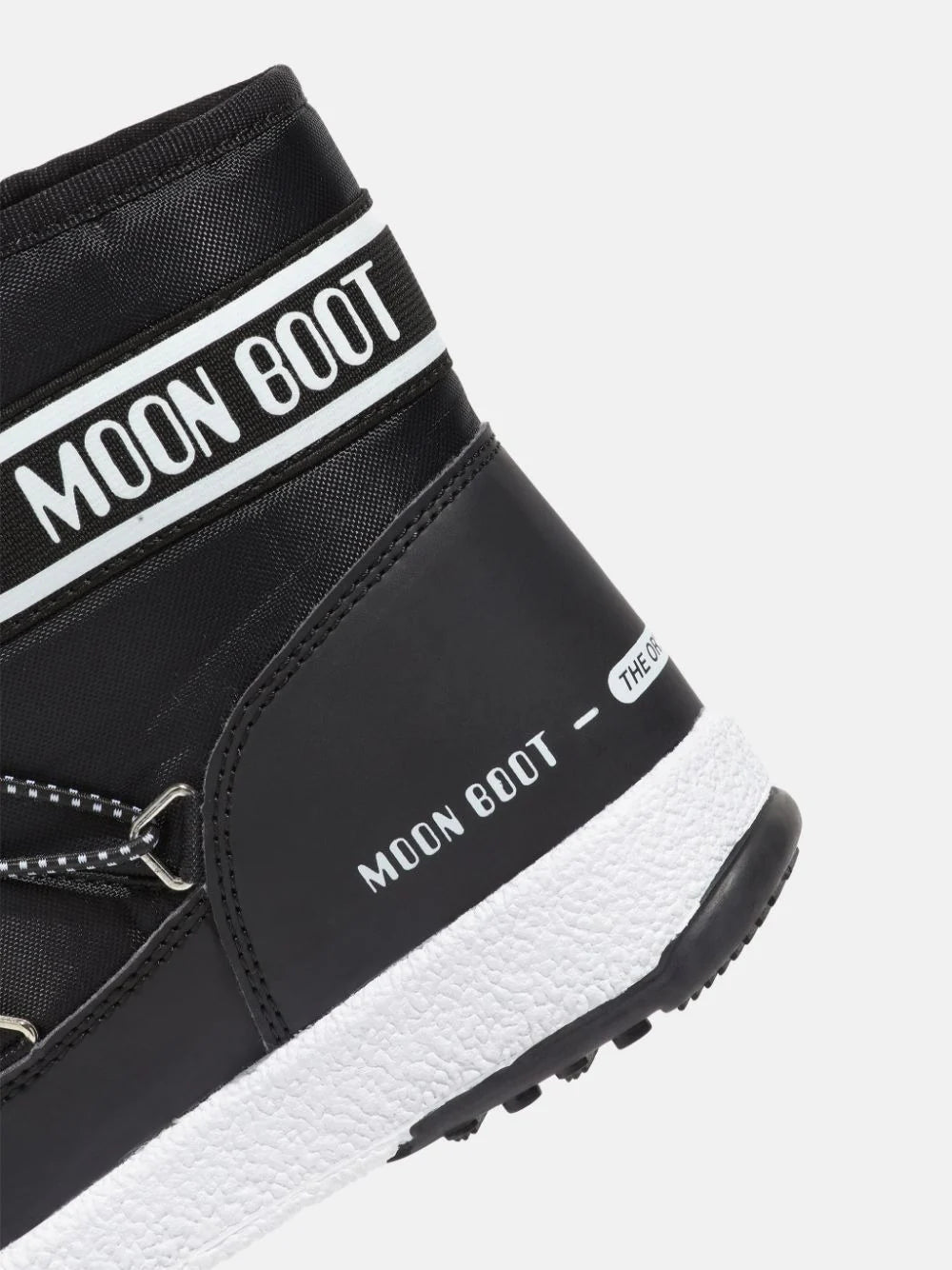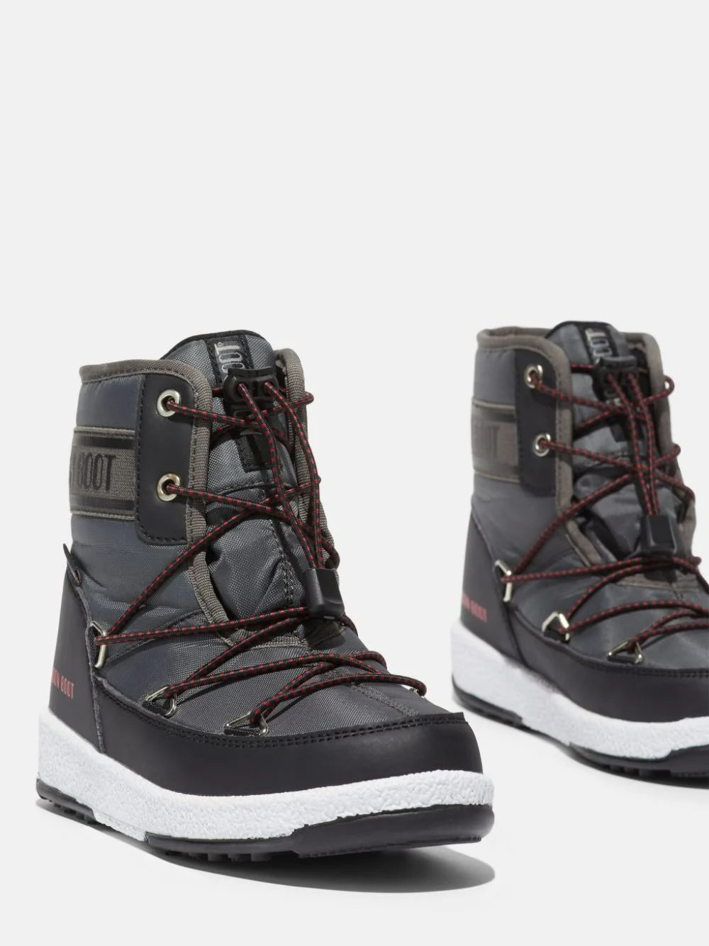 The Moon Boot Junior Boy Mid is a scaled-down, mid-calf height, insulated snow boot designed for children, inspired by NASA astronaut gear, offering warmth and weather protection through a waterproof membrane and nylon upper.