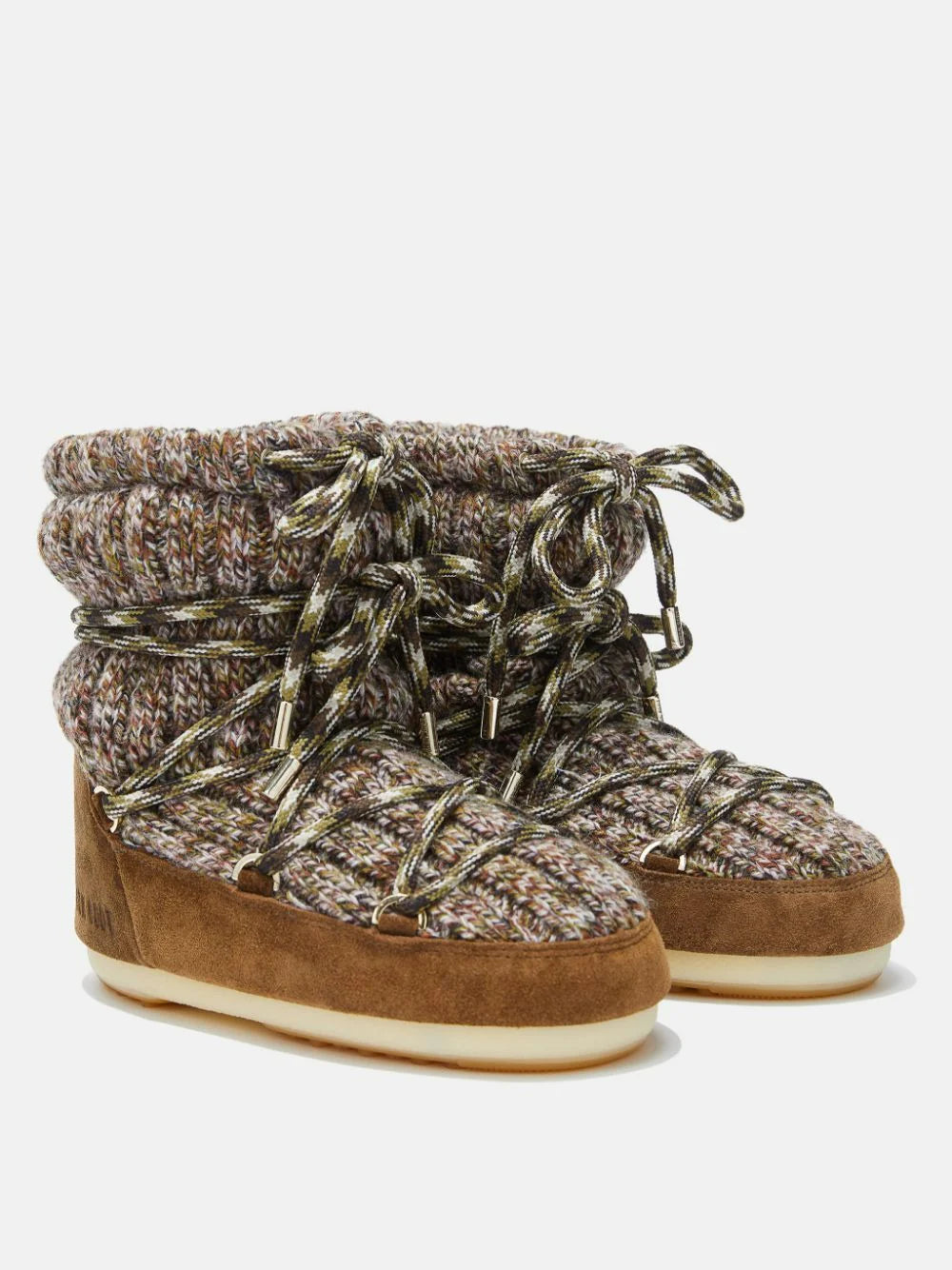 The Moon Boot Light Low Wool is a soft wool and suede, short ankle boot designed for après-ski and city use, offering warmth, insulation, and a flexible, narrower silhouette than traditional Moon Boots. Key features include a lightweight midsole, a rubber tread sole with suction pads for grip, multicoloured criss-cross tubular laces, a drawstring at the top, and a multisize foam lining.