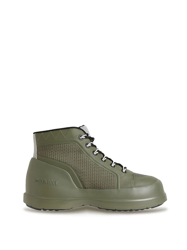 The Moon Boot Luna Trek Mid Nylon is a stylish, water-repellent, and warm ankle-high boot designed for both urban wear and snowy paths. It features a durable nylon upper, visible topstitching, an EVA midsole, and a thermoplastic rubber treaded sole with suction pads for excellent grip. This model offers comfort and warmth with a contemporary, chunky aesthetic, inspired by hiking footwear, and includes a lace-up front for a secure fit.
