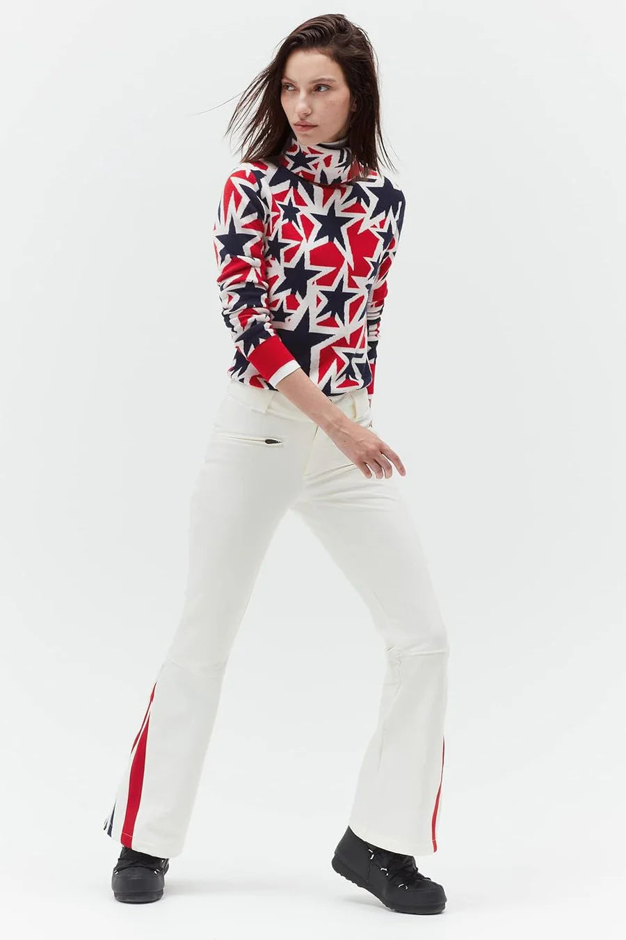 If you are going to toe the line between fashion and function, do it in thermal, waterproof trousers complete with a chic chevron-print flare. Mid-rise, four-way stretch fabric moves with you and provides the perfect amount of coverage on and off the slopes. A soft fleece lining keeps cosy warmth in while an inner boot cuff keep snow and water out. That is one way to earn your ski-style stripes.