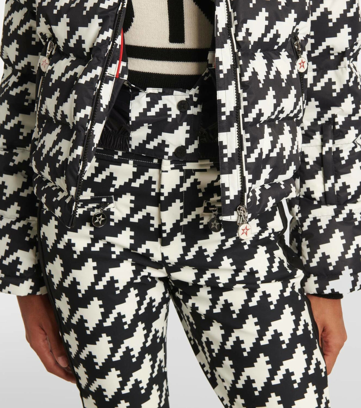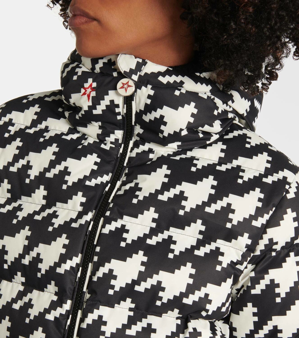 Material: 100% polyester. Care instructions: machine wash at 30 degrees. Made in China. Designer color name: Houndstooth - Black,Snow White. Lining: 100% nylon. Fully lined. Filling: 90% down, 10% feathers. Contains non-textile parts of animal origin. Closure: two-way zipped front. Pockets: internal pockets, zipped pockets. Hood.