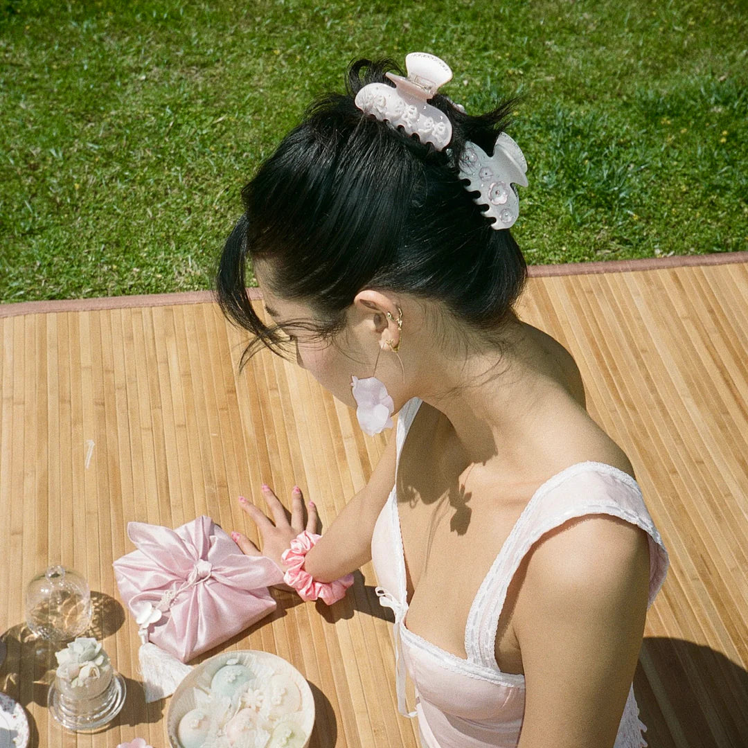 Sweet as can be, this clip is made with beautiful tiny stones and cellulose acetate. Designed with love and ultra-femininity in mind, our Sweetheart Clip will hold your hair from morning until night. Perfect for a low bun or half-up-half-down look. Don't miss out on the perfect ballerina accessory.